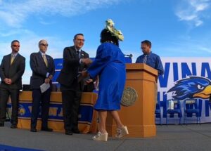 Student shakes hand with Dr. Rivera on graduation stage.